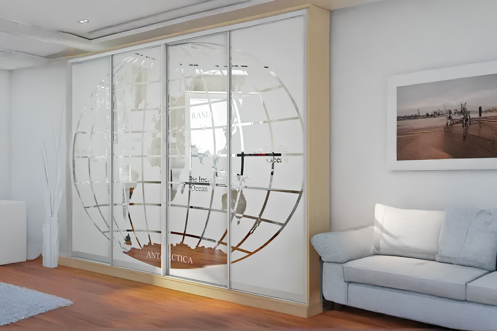Четырёхстворчатый зеркальный шкаф-купе с трафаретом «Глобус» — это стильное и функциональное решение для интерьера. Он идеально впишется в любую комнату, добавляя ей оригинальности и изысканности. Зеркальные дверцы шкафа визуально увеличивают пространство, а трафарет «Глобус» придаёт ему уникальный вид. Мы можем выполнить работу по вашим размерам и индивидуальным предпочтениям. Модель представлена в следующем исполнении: